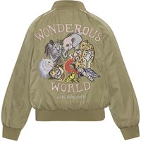 Hatty is een groen bomberjack met op de achterkant verschillende dieren met de tekst "Wonderous World’ geborduurd. De jas heeft ribboord rond de hals, onderkant en mouwen.