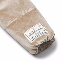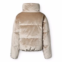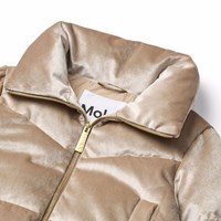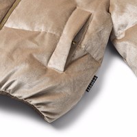 Goudenbruine fluwelen jas gemaakt van gerecycled polyester. De jas heeft een opstaande kraag, zijzakken en elastiek rond de mouwen en onderkant. De jas heeft een beige voering en is gevoerd met gerecycled polyester vulling, wat zorgt voor een gelijkmatige zachtheid en optimale warmte-isolatie.