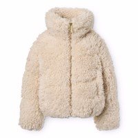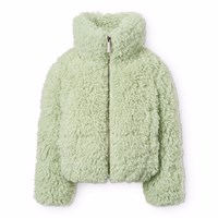 Groene imitatiebontjas met schapenvacht-look gemaakt van gerecycled polyester. De jas heeft een opstaande kraag, zijzakken en elastiek rond de mouwen en onderkant. De jas heeft een beige voering en is gevoerd met gerecyclede polyester vulling, wat zorgt voor gelijkmatige zachtheid en optimale warmte-isolatie.