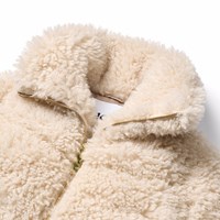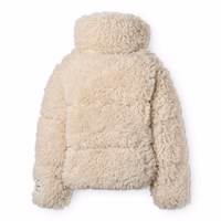 Gebroken witte imitatiebontjas met schapenvachtlook gemaakt van gerecycled polyester. De jas heeft een opstaande kraag, zijzakken en elastiek rond de mouwen en onderkant. De jas heeft een beige voering en is gevoerd met gerecyclede polyester vulling, wat zorgt voor een zachte en optimale warmte-isolatie.