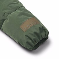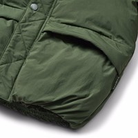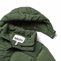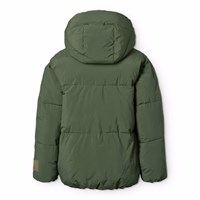 Groene waterafstotende jas gemaakt van gerecycled nylon. De jas heeft een afneembare capuchon en een rits met een flap die sneeuw, wind en regen buiten houdt. Het heeft voorzakken en elastische manchetten om de wind buiten te houden. De jas is gevoerd met gerecyclede polyester vulling, wat zorgt voor een gelijkmatige zachtheid en optimale thermische isolatie. Kenmerken: Wind- en waterbestendig. Waterkolomdruk: 5.000 mm. Ademend vermogen: 3.000 g/m2/24u. PFC-vrij (PFOS en PFOA).