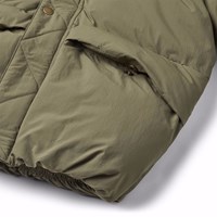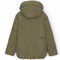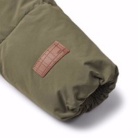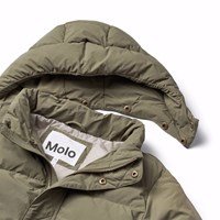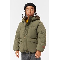 Waterafstotende olijfgroene jas van gerecycled nylon. De jas heeft een afneembare capuchon en een rits met een flap die sneeuw, wind en water buiten houdt. Er zijn zakken aan de voorkant en een verstelbare elastiek aan de onderkant, die de wind buiten houdt en de warmte beter vasthoudt. De jas is gevoerd met parel padding,een gerecycled polyester vulling die zorgt voor een constante zachtheid, optimale warmte en gemakkelijk onderhoud bij het wassen. De waterafstotende oppervlakte van de jas is vrij van PFOS en PFOA.