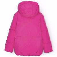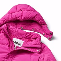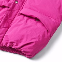 Waterafstotende roze jas van gerecycled nylon. De jas heeft een afneembare capuchon en een rits met een flap die sneeuw, wind en water buiten houdt. Er zijn zakken aan de voorkant en een verstelbare elastiek aan de onderkant, die de wind buiten houdt en de warmte beter vasthoudt. De jas is gevoerd met parel padding, een gerecycled polyester vulling die zorgt voor een constante zachtheid, optimale warmte en gemakkelijk onderhoud bij het wassen. De waterafstotende oppervlakte van de jas is vrij van PFOS en PFOA.