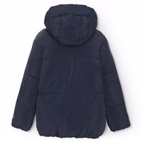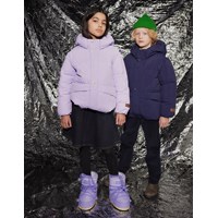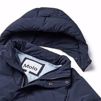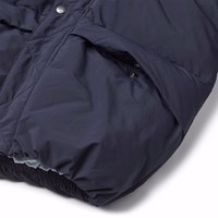Waterafstotende donkerblauwe jas van gerecycled nylon. De jas heeft een afneembare capuchon en een rits met een flap die sneeuw, wind en water buiten houdt. Er zijn zakken aan de voorkant en een verstelbare elastiek aan de onderkant, die de wind buiten houdt en de warmte beter vasthoudt. De jas is gevoerd met parel padding, een gerecycled polyester vulling die zorgt voor een constante zachtheid, optimale warmte en gemakkelijk onderhoud bij het wassen. De waterafstotende oppervlakte van de jas is vrij van PFOS en PFOA.