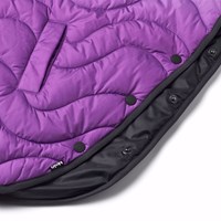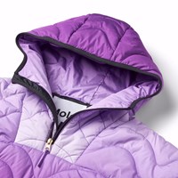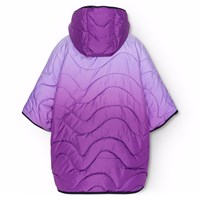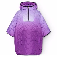 Waterafstotende poncho in paarse tinten, beginnend met een lichtpaarse tint op de schouders en overgaand naar een donkerdere paarse kleur aan de onderkant. De poncho heeft een capuchon, een opstaande kraag en een rits met een kinbeschermer aan de voorkant. Er zijn drukknopen aan de zijkanten voor een goede pasvorm en betere isolatie. Jas en vulling zijn van gerecycled polyester. Het waterafstotende oppervlak is vrij van PFOS en PFOA.