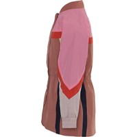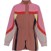 Heather is een stoere en vrouwelijke parka in roze en oud roze met brede, rode en zwarte neon-gekleurde strepen. De jas heeft ribboorden rond de hals en mouwen. Het heeft een ritssluiting aan de voorkant en een elastische taille die kan worden aangepast.