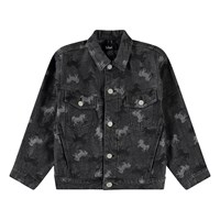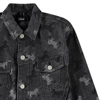 Donkergrijze spijkerjas van zacht katoen met een ingeweven patroon van zwarte en lichtgrijze paarden. De jas heeft een overhemdkraag, knoopsluiting aan de voorzijde en zakken op de borst en in de zijnaden. Aan de achterkant heeft de jas elastiek in de taille, waardoor het een oversized look krijgt. Maten 92 t/m 134 zijn voorzien van drukknopen, waardoor kinderen de jas makkelijker zelf kunnen vastmaken. Maten 140-176 worden geleverd met een normale knoopsluiting.