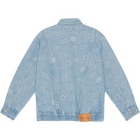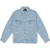 Lichtblauwe spijkerjack met een decoratieve geweven stof met smileys en peace tekens. De jas heeft een klassieke rechte kraag, een knoopsluiting aan de voorkant en zakken op de borst en aan de zijkanten. Aan de onderkant van de achterkant zit elastiek voor een ruimvallende pasvorm. Maten 92 t/m 134 hebben drukknopen die op knopen lijken, zodat kleine kinderen de jas makkelijker kunnen dicht doen. Maten 140-176 hebben een traditionele knoopsluiting.