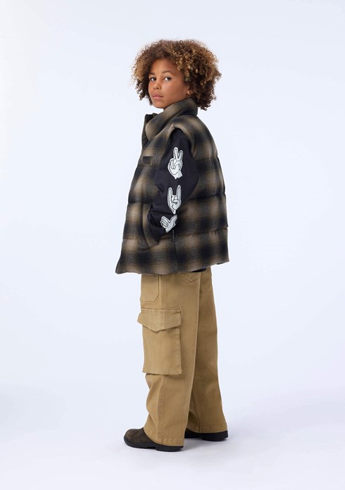 Geruite bruine gewatteerde bodywarmer gemaakt van gerecycled polyester en wol. De bodywarmer heeft een ritssluiting, hoge kraag en grote armsgaten, waardoor een jas of dikke trui eronder gedragen kan worden. Het heeft voorzakken, een binnenzak en verstelbare interne elastische banden aan de onderkant om de wind buiten te houden.