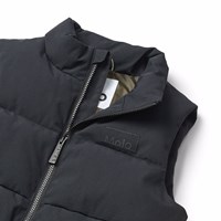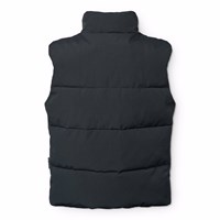 Zwarte gewatteerde bodywarmer gemaakt van gerecycled nylon met een ritssluiting aan de voorkant, hoge kraag en grote armsgaten, waardoor een jas of dikke trui eronder gedragen kan worden. De bodywarmer heeft voorzakken, een binnenzak en een verstelbare interne elastiek aan de onderkant om de wind buiten te houden.