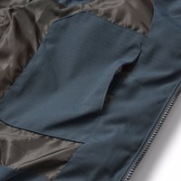 Donkerblauwe gewatteerde bodywarmer gemaakt van gerecycled nylon met een ritssluiting aan de voorkant, hoge kraag en grote armsgaten, waardoor een jas of dikke trui eronder gedragen kan worden. De bodywarmer heeft voorzakken, een binnenzak en een verstelbare interne elastiek aan de onderkant om de wind buiten te houden.