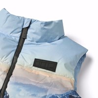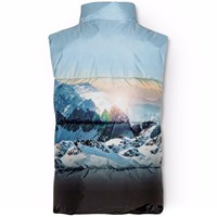 Warm bodywarmer van gerecycled polyester voor koudere dagen, met een print van de besneeuwde Alpen, zonnestralen en een heldere lucht. De bodywarmer heeft een opstaande kraag, een ritssluiting aan de voorkant en grote armsgaten, zodat er een jas of een dikke trui onder gedragen kan worden. Er zit een grote reflector op de achterkant om de zichtbaarheid in het verkeer te vergroten, evenals een verstelbare elastiek aan de binnenkant van de onderkant om de wind buiten te houden.
