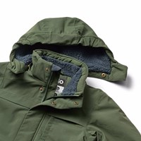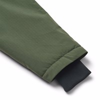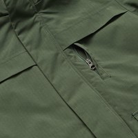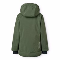 Wind- en waterdichte donkergroene jas gemaakt van gerecycled nylon met ritssluiting, hoge kraag en afneembare gevoerde capuchon. De jas is ontworpen met voorzakken, een borstzak met rits, ribboorden rond de mouwen die effectief helpen tegen de wind. Aan de achterkant bevindt zich een grote reflector die de zichtbaarheid in het verkeer vergroot. De jas is gevoerd met zachte, gerecyclede polyester vulling, wat zorgt voor een comfortabele en optimale thermische isolatie.
