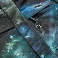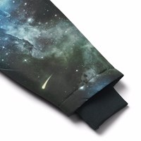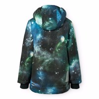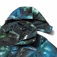 Wind- en waterdichte jas met ruimteprint gemaakt van gerecycled polyester. De jas heeft een ritssluiting met klep, een hoge kraag en een afneembare gevoerde capuchon. De jas is ontworpen met voorzakken, een borstzak met rits, ribboorden ronde de mouwen om effectief te beschermen tegen de wind. Aan de achterkant zit een grote reflector die de zichtbaarheid in het verkeer vergroot. De jas is gevoerd met zacht, gerecycled polyester vulling, wat zorgt voor een comfortabele en optimale thermische isolatie.