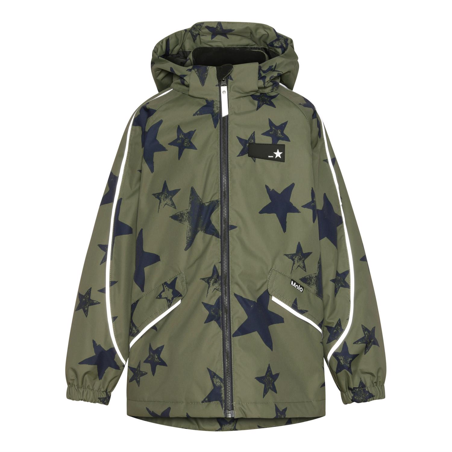 Heiko is Molo's nieuwe unisex jas in een groene kleur met een sterrenprint. De jas heeft reflecterende biezen en Molo's iconische sterreflectoren aan de voor- en achterkant. De jas kan worden ingesnoerd met koordjes in de taille om een mooiere pasvorm te creëren. Heiko is ademend, wind- en waterdicht en heeft getapete naden. De voering en de tussenvoering zijn 100% gerecycled en gemaakt van gerecyclede plastic flessen. Dit product heeft een waterbestendige, PFC-vrije oppervlaktebehandeling (bevat bv. geen PFOS, PFOA, enz.). Waterkolomdruk: 12.000 mm en ademend: 8.000 g / m2 / 24 uur.