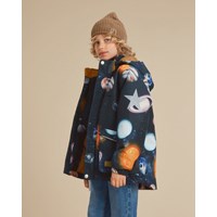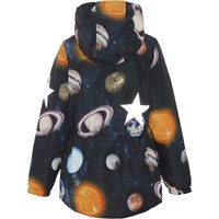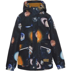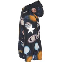 Heiko is Molo's nieuwe donkerblauwe unisex jas. met planeten en het heelal. Heiko maakt deel uit van Molo's Outdoor-Proof lijn die gemaakt is voor actieve kinderen. De jas is perfect voor matig koude winterdagen. Draag op zeer koude dagen Heiko met een heerlijk warme fleece eronder. De jas heeft reflecterende biezen en Molo's iconische sterreflectoren aan de zijkant en op de achterkant. De jas kan worden vastgemaakt met koordjes in de taille om een meer welgevormde pasvorm te creëren. Heiko is wind-, waterdicht, ademend en heeft getapete naden. Dit product heeft een waterbestendige, PFC-vrije oppervlaktebehandeling (Bevat bijvoorbeeld geen PFOS, PFOA, etc). Waterkolomdruk: 12.000 mm. Ademend: 8.000 g/m2/24u.