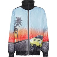 Higer is een langer bomberjack met een print van een snelle auto die richting de zonsondergang rijdt. De jas heeft een zwarte achterkant.