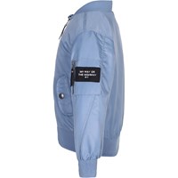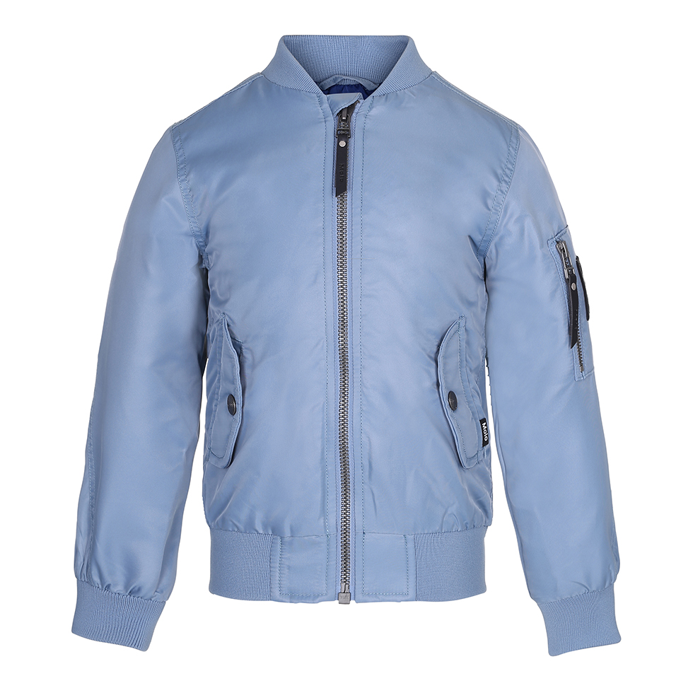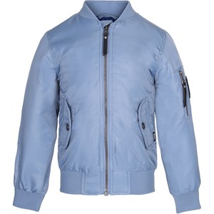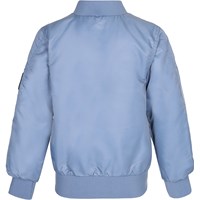 Sportieve, blauwe bomberjas met een rits op de voorkant, zakken aan de zijkant en op één mouw en brede elastische band aan de hals, mouwen en zoom. Dit product heeft een waterbestendige, PFC-vrije oppervlaktebehandeling (bevat bijvoorbeeld geen PFOS, PFOA, enz.).
