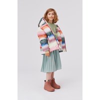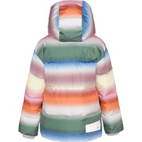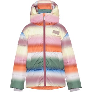 Hilo is een winterjas met een pastelkleurige regenboogprint met een ritssluiting aan de voorkant. De jas heeft een hoge kraag en reflectoren op de achterkant. Hilo is gevoerd met technisch dons, dat heet pearl padding, waardoor het extra zacht is, warmte vasthoudt en donsachtig aanvoelt. Dit product heeft een waterbestendige, PFC-vrije oppervlaktebehandeling (Bevat bijvoorbeeld geen PFOS, PFOA, etc). Waterkolomdruk: 5.000 mm. Ademend: 5.000 g/m2/24u.