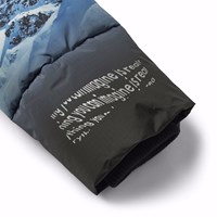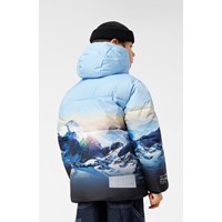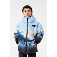 Warme gewatteerde jas van gerecycled polyester voor een koude winter, met een print van de besneeuwde Alpen met zonnestralen en een helderblauwe lucht. De jas heeft een afneembare capuchon, zijzakken en mouwen met geribbelde manchetten, die effectief wind, sneeuw en regen buiten houden en ervoor zorgen dat handschoenen op hun plaats blijven. De jas heeft een grote reflector op de achterkant om de zichtbaarheid in het verkeer te vergroten.