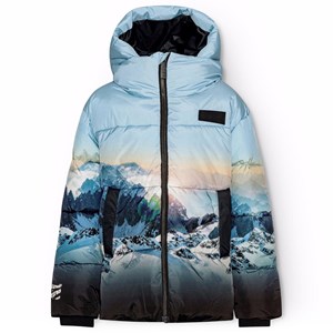 Warme gewatteerde jas van gerecycled polyester voor een koude winter, met een print van de besneeuwde Alpen met zonnestralen en een helderblauwe lucht. De jas heeft een afneembare capuchon, zijzakken en mouwen met geribbelde manchetten, die effectief wind, sneeuw en regen buiten houden en ervoor zorgen dat handschoenen op hun plaats blijven. De jas heeft een grote reflector op de achterkant om de zichtbaarheid in het verkeer te vergroten.