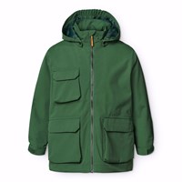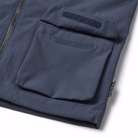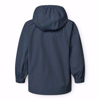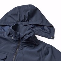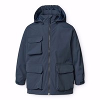 Donkerblauwe wind- en waterdichte jas van gerecycled nylon met afneembare capuchon. De jas heeft een normale pasvorm, voorzakken met klittenbandsluiting, verstelbaar klittenband rond de polsen, waterdichte naden en een ritssluiting met kinbescherming en aan de binnenkant een windflap om de wind buiten te houden. De technische kenmerken van de jas maken het geschikt als regenjas.
