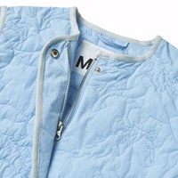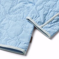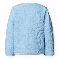 Lichtblauwe waterafstotende thermische jas van gerecycled nylon met een doorgestikt paardenpatroon. De jas heeft een normale pasvorm, ritssluiting met windflap en bijpassende biaisband voor een mooie afwerking.
