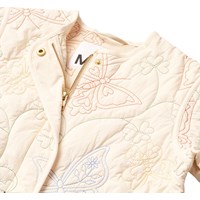 Licht gewatteerde jas in een lichte, crèmekleurige tint met prachtige geborduurde motieven van vlinders, bloemen en klavers in fijne kleuren. De jas heeft een verborgen ritssluiting met een drukknoop en een eenvoudig, rond gesneden ontwerp zonder kraag. Een zachte en decoratieve keuze voor lente- en nazomerdagen.