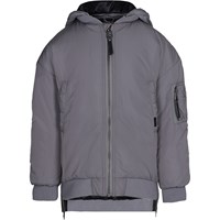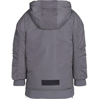 Grijs lang gevoerde jas met een afneembare capuchon, een ritssluiting aan de voorkant, steekzakken en een enkele zak op een mouw. Het jasje heeft ribboord aan de hals, mouwen en onderkant. Dit product heeft een waterbestendige, PFC-vrije oppervlaktebehandeling (bevat geen, bijvoorbeeld, PFOS, PFOA, etc.). De naden zijn niet volledig waterdicht.