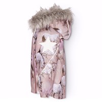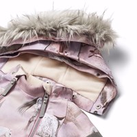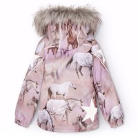 Wind- en waterdichte winterjas van gerecycled polyester voor een koude winter met een print van paarden op een dromerige achtergrond in de tinten roze en paars. De jas heeft een afneembare gevoerde capuchon met een afneembare boord van imitatiebont en twee ritsen aan de voorkant met kinbescherming om te voorkomen dat de huid beschadigd. De ritsen hebben een interne overslag, die helpt om sneeuw, wind en water buiten te houden. De jas heeft reflectoren op de mouwen, achterkant en capuchon, evenals twee sterreflectoren op de mouwen, om de zichtbaarheid in het verkeer te vergroten. De mouwen hebben een elastische boord die effectief wind, sneeuw en regen buiten houdt en ervoor zorgt dat de handschoenen op hun plaats blijven. De jas is gevoerd met fleece en 3M™ Thinsulate™, wat zorgt voor meer bewegingsvrijheid voor je kind vanwege het lichte gewicht.