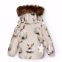 Wind- en waterdichte winterjas van gerecycled polyester voor een koude winter met een print van schattige konijntjes tussen de sneeuwklokjes op een grijze achtergrond. De jas heeft een afneembare gevoerde capuchon met een afneembare boord van imitatiebont en twee ritsen aan de voorkant met kinbescherming om te voorkomen dat de huid beschadigd. De ritsen hebben een interne overslag, die helpt om sneeuw, wind en water buiten te houden. De jas heeft reflectoren op de mouwen, achterkant en capuchon, evenals twee sterreflectoren op de mouwen, om de zichtbaarheid in het verkeer te vergroten. De mouwen hebben een elastische boord die effectief wind, sneeuw en regen buiten houdt en ervoor zorgt dat de handschoenen op hun plaats blijven. De jas is gevoerd met fleece en 3M™ Thinsulate™, wat zorgt voor meer bewegingsvrijheid voor je kind vanwege het lichte gewicht.