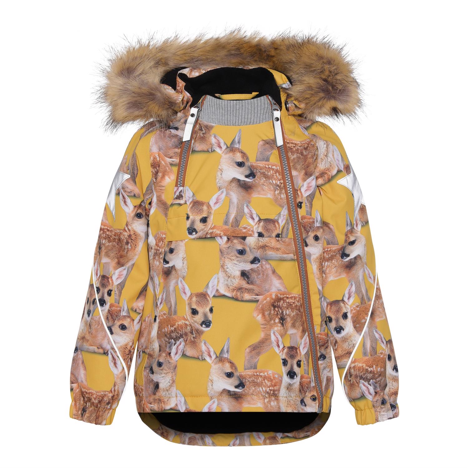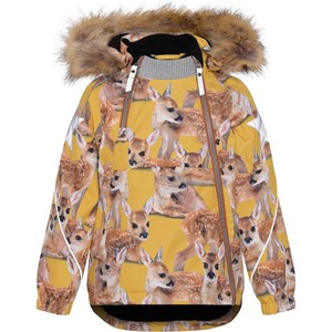 Hopla Fur is een gele functionele en waterdichte winterjas met een print van hertjes. De voering en tussenvoering van de jas zijn gerecycled en gemaakt van gerecycled polyester. Het heeft een afneembare capuchon met een afneembare boord van imitatiebont, schuine ritsen aan de voorkant, ribboord rond de hals, elastiek rond de mouwen en Molo's iconische sterreflectoren op beide bovenmouwen en aan de onderkant op de achterkant. De jas heeft hoogwaardig fleece op kwetsbare plekken en getapete naden. Dit product heeft een waterbestendige, PFC-vrije oppervlaktebehandeling (bevat bv. geen PFOS, PFOA, enz.). Waterkolomdruk: 15.000 mm. ademend: 15.000 g / m2 / 24 uur. Het heeft klittenband voor bretels die kunnen worden gekocht.