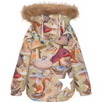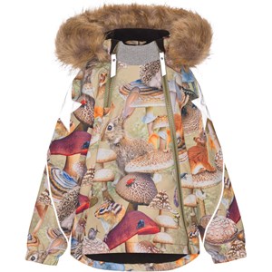 Hopla is een winterjas in een klasse apart. Het is vooral geschikt voor jonge kinderen. Hopla heeft vele eigenschappen, zoals een extreem hoge waterkolomdruk en ademend vermogen, en met zijn prachtige prints en kleuren is het elk jaar een echte winnaar. Deze winterjas sluit geen compromissen op details en is natuurlijk ook gemaakt van verantwoord gerecyclede materialen. Deze Hopla is beige en heeft ene print van dieren uit het bos en prachtige paddenstoelen.