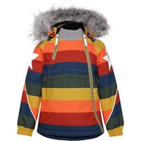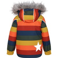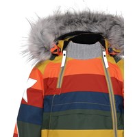 Hopla Fur is een functionele en waterdichte winterjas met een regenboogprint. De voering en tussenvoering van de jas zijn gerecycled en gemaakt van gerecycled polyester. Het heeft een afneembare capuchon met een afneembare boord van imitatiebont, schuine ritsen aan de voorkant, ribboord rond de hals, elastiek rond de mouwen en Molo's iconische sterreflectoren op beide bovenmouwen en aan de onderkant op de achterkant. De jas heeft hoogwaardig fleece op kwetsbare plekken en getapete naden. Dit product heeft een waterbestendige, PFC-vrije oppervlaktebehandeling (bevat bv. geen PFOS, PFOA, enz.). Waterkolomdruk: 15.000 mm. ademend: 15.000 g / m2 / 24 uur. Het heeft klittenband voor bretels die kunnen worden gekocht.