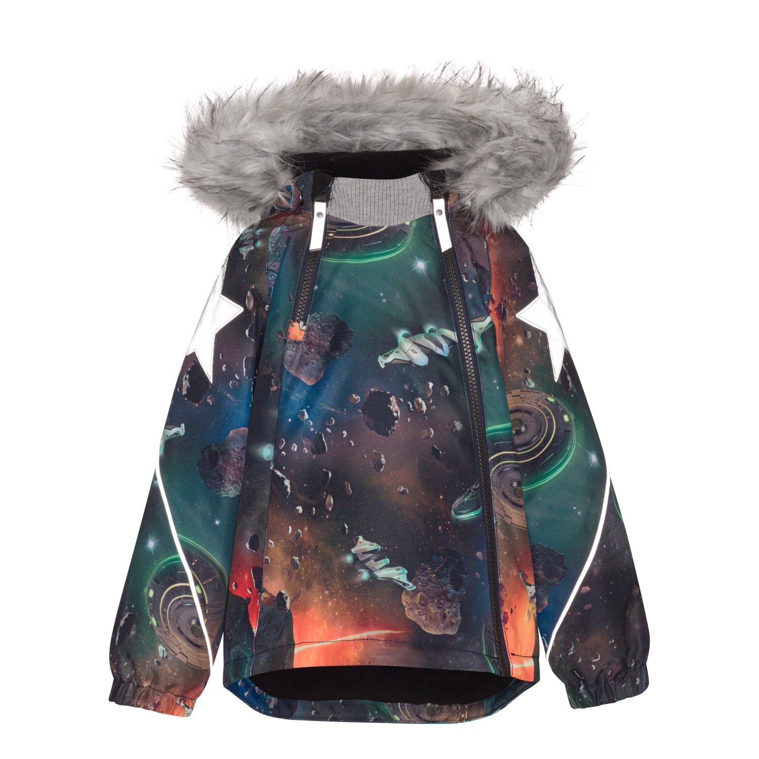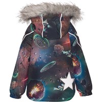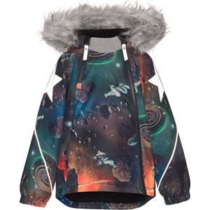 Hopla is een winterjas in een klasse apart. Het is vooral geschikt voor jonge kinderen. Hopla heeft vele eigenschappen, zoals een extreem hoge waterkolomdruk en ademend vermogen, en met zijn prachtige prints en kleuren is het elk jaar een echte winnaar. Deze winterjas sluit geen compromissen op details en is natuurlijk ook gemaakt van verantwoord gerecyclede materialen. Deze Hopla heeft een print van ruimteschepen en planeten.