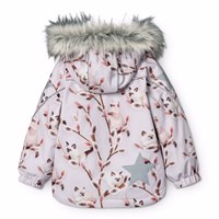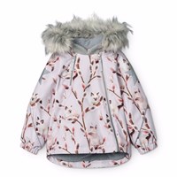 Paarse wind- en waterdichte winterjas gemaakt van gerecycled polyester met een print van mooie wilgentakken en een wit katje. De jas heeft een afneembare gevoerde capuchon met afneembare imitatiebont, twee ritsen aan de voorkant met een binnenflap en een geribbelde kinbeschermer om te voorkomen dat de huid vast komt te zitten. De jas heeft reflecterende tape op de mouwen, achterkant en capuchon en twee reflecterende sterren om de zichtbaarheid in het verkeer te waarborgen. De mouwen hebben een elastische boord rond de mouw die de wind, sneeuw en regen buiten houdt en de handschoenen op hun plaats houdt. Bovendien is de jas gevoerd met gerecycled polyester fleece en 3M™ Thinsulate™, wat helpt om de warmte vast te houden.