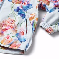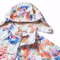 Lichtblauwe wind- en waterdichte jas van gerecycled polyester met een kleurrijke all over print van artistieke tulpen. De jas heeft een afneembare capuchon, zakken met windflappen, ritssluiting met kinbescherming, aan de binnenkant een windflap en elastiiek rond de polsen die de wind effectief buiten houden. Aan de binnenkant zit een verstelbaar elastiek in de taille om het silhouet en de pasvorm van de jas aan te passen. De technische kenmerken van de jas maken hem geschikt als regenjas.