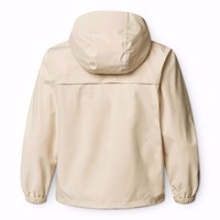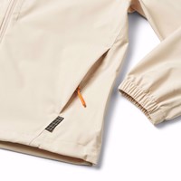 Beige wind- en waterdichte jas met capuchon van gerecycled polyester. De jas heeft een normale pasvorm, voorzakken met ritsen, verstelbare elastiek aan de onderkant, elastiek bij de mouwen, waterdichte naden en een rits met stormflap om droog te blijven.