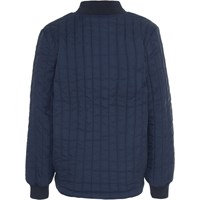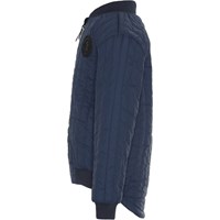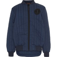 Hudson is een blauwe jas met geweldige zichtbare stikseldetails en een print op de borst. De jas is langer aan de achterkant en heeft ribboord rond de hals, mouwen en onderkant.