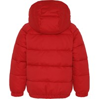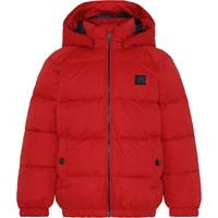 Hugo is een korte rode winterjas met een zwarte ritssluiting en zwarte knopen. Het heeft een afneembare capuchon, steekzakken en elastiek aan de mouwen en de onderkant. De jas is gevuld met parelvulling voor extra zachtheid en een donsachtig gevoel. De buitenstof heeft een waterbestendige, PFC-vrije oppervlaktebehandeling (bevat geen, bijvoorbeeld PFOS, PFOA, enz.).