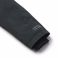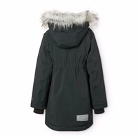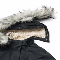 Wind- en waterdichte zwarte jas gemaakt van gerecycled nylon met ritssluiting, hoge kraag en afneembare capuchon met imitatiebont. De jas is knielengte en ontworpen met voorzakken en ribboorden rond de mouwen om effectief te beschermen tegen de wind. Er zit een grote reflector op de achterkant om de zichtbaarheid in het verkeer te vergroten. De jas is gevoerd met zachte, gerecyclede polyester vulling voor comfort en optimale isolatie.