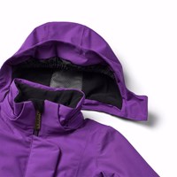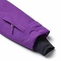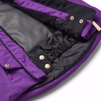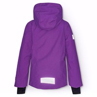 Paarse wind- en waterdichte ski-jas van gerecycled nylon. De jas heeft een afneembare gevoerde capuchon en een rits met een flap om de wind buiten te houden. De jas heeft grote reflectoren om de zichtbaarheid in het verkeer te vergroten. Hij heeft ook gevoerde ritszakken, een zak op de mouw voor de skipas en een binnenzak. De jas heeft ook een windbeschermer rond de taille en mouwopening met duimgaten om sneeuw, wind en water buiten te houden. Hij is gevoerd met fleece en 3M™ Thinsulate™, wat zorgt voor meer bewegingsvrijheid voor het kind.