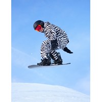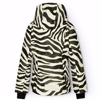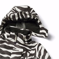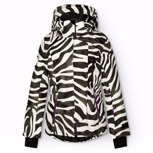 Gestreepte zebra wind- en waterdichte ski-jas van gerecycled polyester. De jas heeft een afneembare gevoerde capuchon en een rits met een flap om de wind buiten te houden. De jas heeft grote reflectoren om de zichtbaarheid in het verkeer te vergroten. Hij heeft ook gevoerde ritszakken, een zakje op de mouw voor de skipas en een binnenzak. De jas heeft ook een windbeschermer rond de taille en mouwopening met duimgaten om sneeuw, wind en water buiten te houden. Hij is gevoerd met fleece en 3M™ Thinsulate™, wat zorgt voor meer bewegingsvrijheid voor het kind.