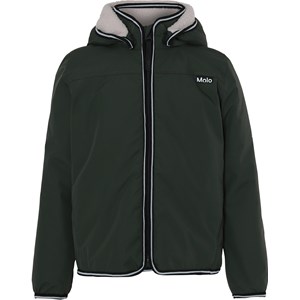 Prachtig gevoerde donkergroene regenjas met een afneembare met fleece gevoerde capuchon. Het heeft een ritssluiting aan de voorkant, zijzakken en Molo's iconische sterreflector bovenaan een mouw en aan de achterkant. De jas is gemaakt van winddicht, ademend en waterafstotende kwaliteit. Het heeft fleece in de capuchon en achterkant en getapete naden. Dit product heeft een waterbestendige, PFC-vrije oppervlaktebehandeling (Bevat geen PFOS, PFOA, enz.) Waterkolom druk: 5.000 mm. Ademend: 5.000 g / m2 / 24 uur.