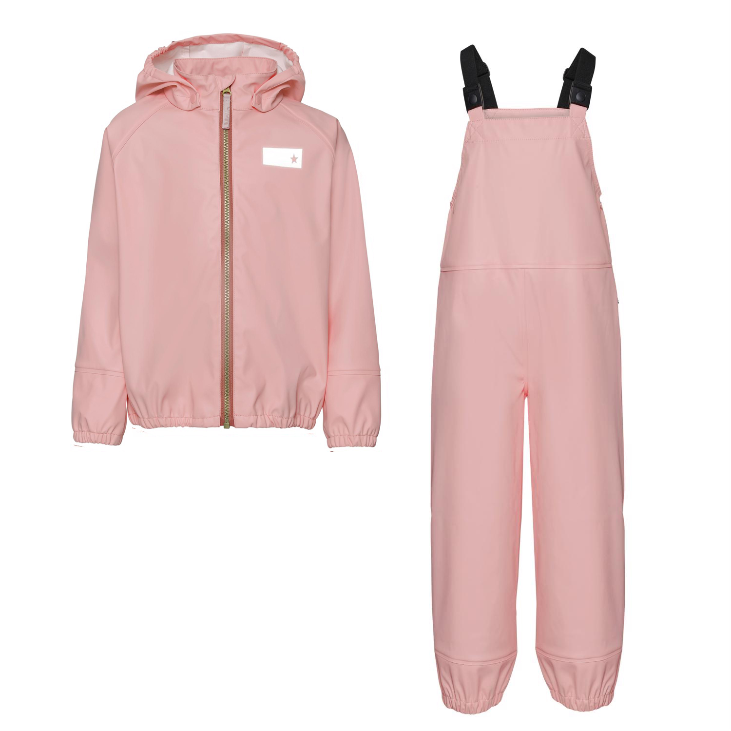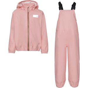Wade is roze regenkleding met een regenjas en een regenbroek. De jas heeft een afneembare capuchon en een ritssluiting aan de voorkant. De broek heeft een bovenstuk, verstelbare schouderbanden en elastiek bij de pijpen. Zowel de jas als de broek hebben Molo's iconische sterreflectoren op de rug. Dit product heeft een waterbestendige, PFC-vrije oppervlaktebehandeling (bevat bijvoorbeeld geen PFOS, PFOA, enz.). Waterkolomdruk: 8.000 mm.