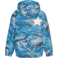 Waiton is een lichtgewicht en functionele regenjas in het blauw met een print van zeedieren in het water. Het heeft een nylon voering. Waiton heeft een afgedekte ritssluiting ter bescherming tegen wind en regen, getapete naden en een afneembare capuchon, twee voorzakken en elastiek aan de capuchon, mouwen en onderkant. De jas heeft Molo`s iconische sterrelfector op de achterkant voor betere zichtbaarheid in het donker. Een van de grootste voordelen van deze regenkleding is dat het ademend is, dus een hoge mate van activiteit resulteert niet in opgesloten vocht aan de binnenkant. Dit product heeft een waterbestendige, PFC-vrije oppervlaktebehandeling (Bevat bijvoorbeeld geen PFOS, PFOA, etc). Waterkolomdruk: 5.000 mm. ademend: 5.000 g/m2/24u.