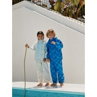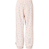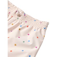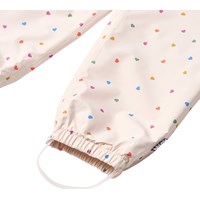Waterdichte regenbroek van gerecycled polyester. De broek is beige met een print van kleine hartjes in verschillende kleuren. Ze hebben een elastische taille met een verstelbaar trekkoord en elastische broekspijpen met afneembare en verstelbare rubberen banden voor laarzen.