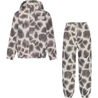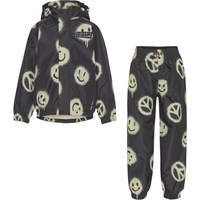 Whalley is een lichtgewicht en functionele regenpak in blauw met een print van prehistorische dieren die in de zee leven. De jas heeft een afgedekte ritssluiting ter bescherming tegen wind en regen, getapete naden, afneembare capuchon en twee voorzakken. De broek heeft getapete naden en verstelbaar elastiek in de taille en elastiek bij de pijpen. Zowel de regenjas als de broek hebben de iconische reflectoren van Molo op de achterkant. Een van de grootste voordelen van het regenpak is dat het ademend is, dus een hoge mate van activiteit resulteert niet in opgesloten vocht aan de binnenkant. Dit product heeft een waterbestendige, PFC-vrije oppervlaktebehandeling (Bevat bijvoorbeeld geen PFOS, PFOA, etc). Waterkolomdruk: 5.000 mm. ademend: 5.000 g/m2/24u.