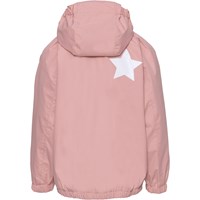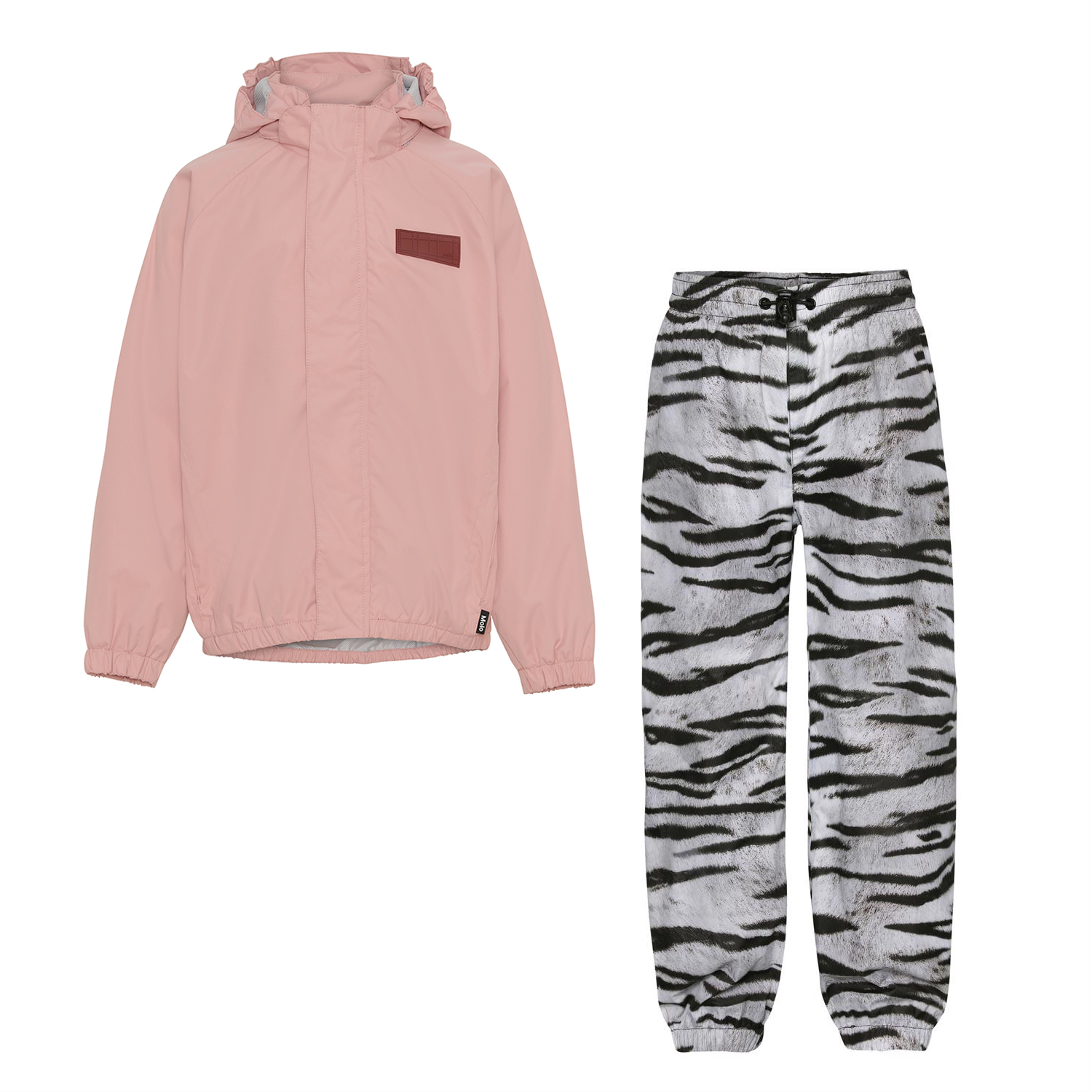 Whalley is lichtgewicht en functionele regenkleding met een tijger gestreepte broek en een roze kleurige jas. De jas heeft een afgedekte ritssluiting ter bescherming tegen wind en regen, getapete naden, afneembare capuchon en twee voorzakken. De broek heeft elastiek in de taille en pijpen. Zowel de jas als de broek hebben Molo's iconische sterreflector op de rug. Dit regenpak heeft een waterafstotende, PFC-vrije oppervlaktebehandeling (bevat bijvoorbeeld geen PFOS, PFOA, etc). Waterkolomdruk: 5.000 mm. ademend: 5.000 g / m2 / 24 uur.
