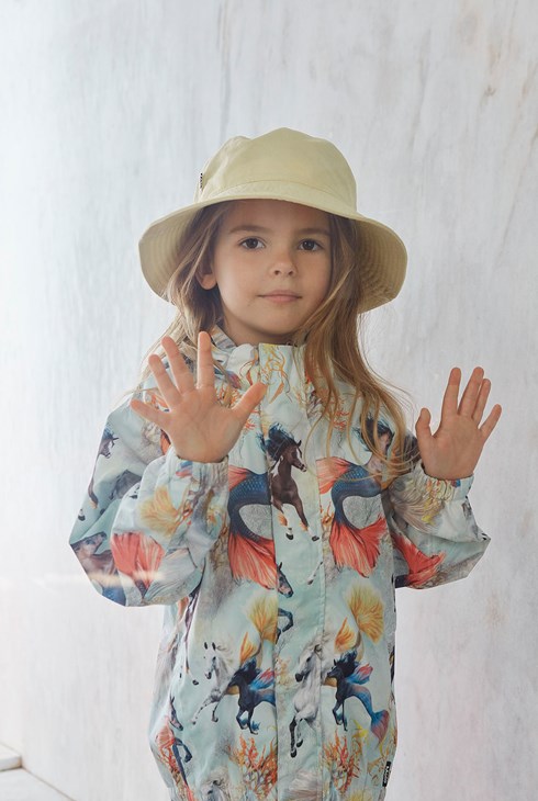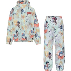 Whalley is lichtgewicht en functionele regenkleding in lichtblauwe met een zeepaarden print. De jas heeft een afgedekte ritssluiting ter bescherming tegen wind en regen, getapete naden, afneembare capuchon en twee voorzakken. De broek heeft elastiek in de taille en pijpen. Zowel de jas als de broek hebben Molo's iconische sterreflector op de rug. Dit regenpak heeft een waterafstotende, PFC-vrije oppervlaktebehandeling (bevat bijvoorbeeld geen PFOS, PFOA, etc). Waterkolomdruk: 5.000 mm. ademend: 5.000 g / m2 / 24 uur.